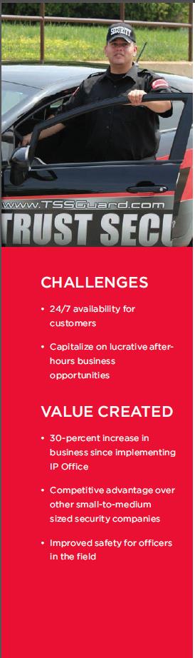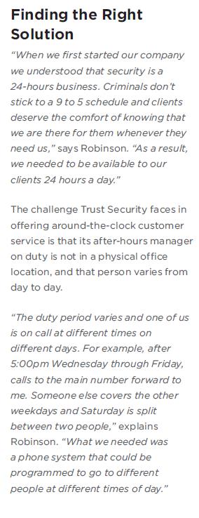 Trust Security’s business has grown by 30 percent since the implementation of the Avaya Powered by IP Office. Robison attributes this spike to the Avaya VoIP solution allowing them to provide more reliable customer service to existing customers and capture lucrative after-hours clients.