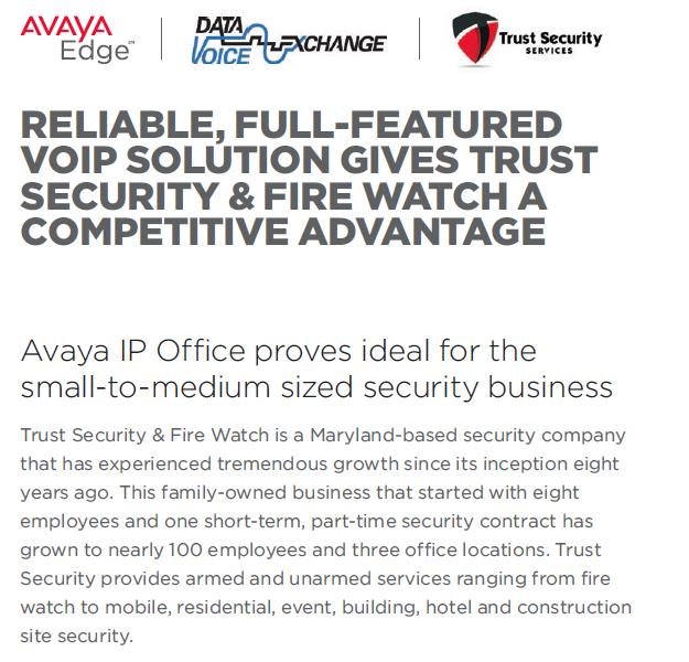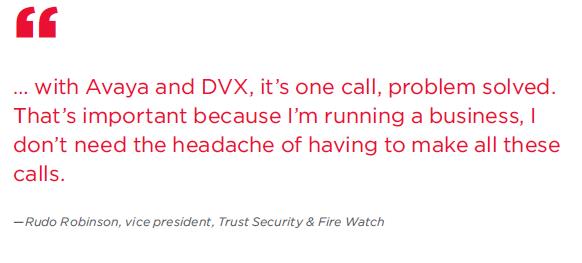 Avaya business partner DVX, Inc. installed the Powered by IP Office solution for Trust Security. Robinson comments favorably on the positive experience he had with the company. “We’re not the typical customer, our platform needs to be robust and do a lot of different things,” he says. “DVX has been very responsive and supportive.”