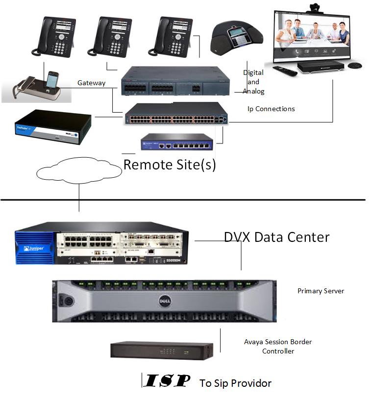 This can be with multiple sites using VPN or MPLS. The main headquarters is at DVX, Inc. Data Center which houses the Server which is virtualized on VMWare . The Server also has a secondary server for resiliency which can also be located at the remote location. There is also the ability to add a gateway to support both Digital and Analog trunks along with the ability for Digital and Analog end points as well. Optional components include Fax servers, Paging equipment and a Call Center Server to name a few.