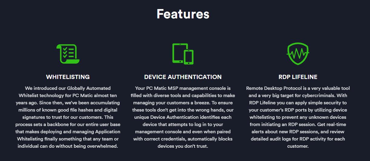 PC Matic MSP Endpoint Suite focuses on proactive detection and believes the best way to do so is through the use of application whitelisting. However, traditional whitelisting is difficult to deploy and even harder for IT staff to manage. PC Matic MSP Endpoint Suite offers an alternative approach, with a globally automated whitelist managed by a team of professional malware researchers that automatically analyze unknown applications and categorize them globally.