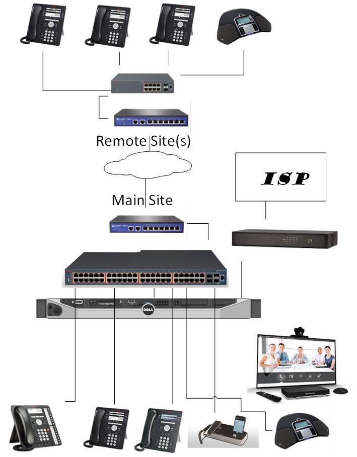 This can be with multiple sites using VPN or MPLS. The main headquarters houses the Server which can be virtualized on VMWare (recomended) or a Standard Avaya Dell Server. The Server also has the capabilities or housing a secondary server at a remote location. There is also the ability to add a gateway to support both Digital and Analog trunks along with the ability for Digital and Analog end points as well. Optional components include Fax servers, Paging equipment and a Call Center Server to name a few.
